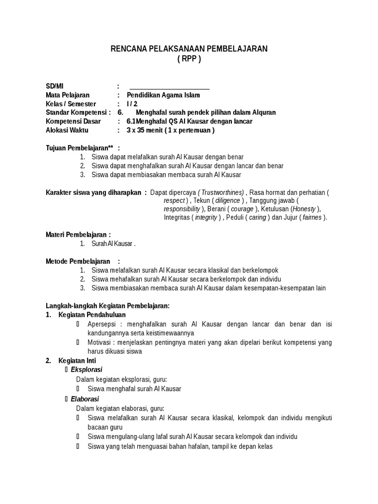 Contoh Rpp Pai Sekolah Dasar Kelas 1 2 3 4 5 Dan 6 Kurikulum 2013